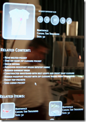 Passive RFID tags (a small circuit on a paper) each costing about Rs 10 are laid inside shirt or trouser packs. When a potential customer selects a shirt and brings it near a LCD panel, it displays all features of the shirt be it colour name, striped /checked, size, along with other sizes available in the same colour and their prices.